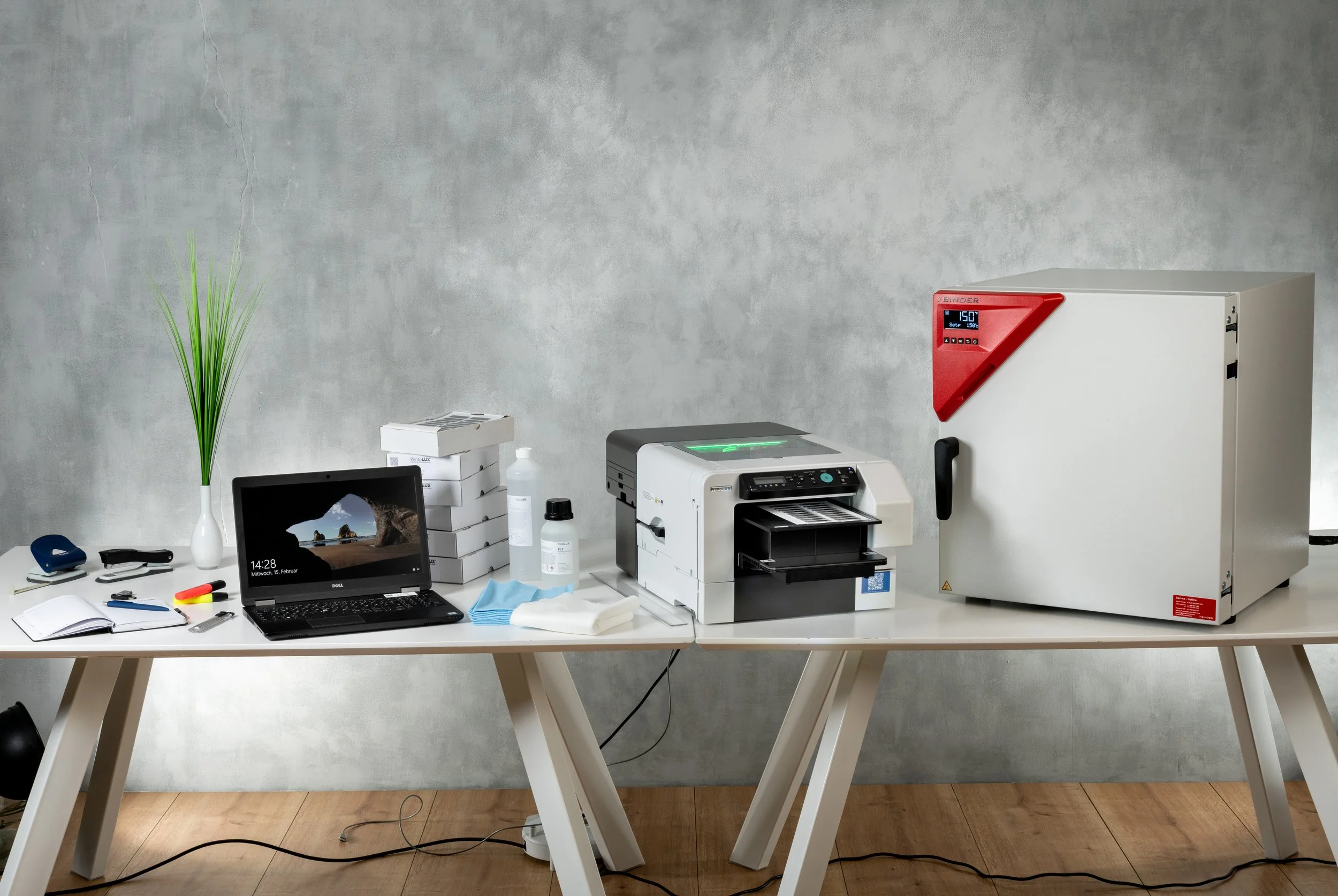 All materials are treated with a primer before printing. This promotes the bonding of ink and material during the following thermosetting.